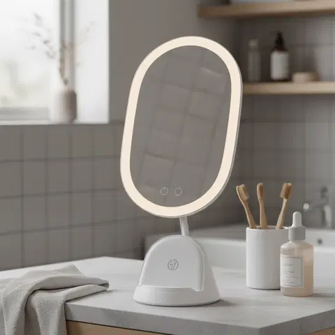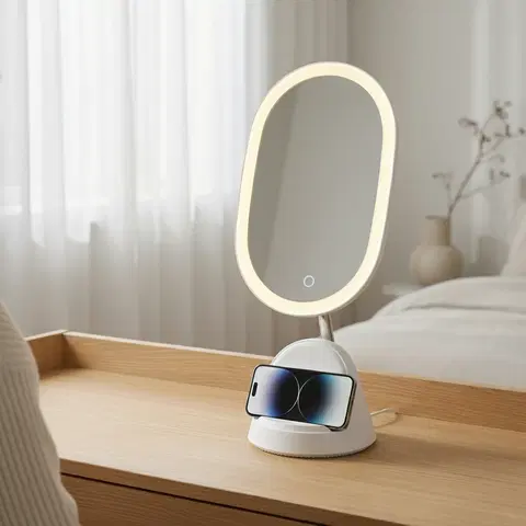 Speilet har en innebygd trådløs ladeplate som lar deg lade telefonen mens du gjør deg klar - helt uten behov for ekstra kabler. I tillegg er det utstyrt med et praktisk mobilstativ som holder telefonen i riktig posisjon, enten du vil følge en sminketutorial, strømme en video, eller ta en rask samtale.