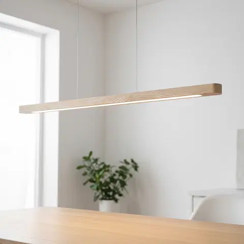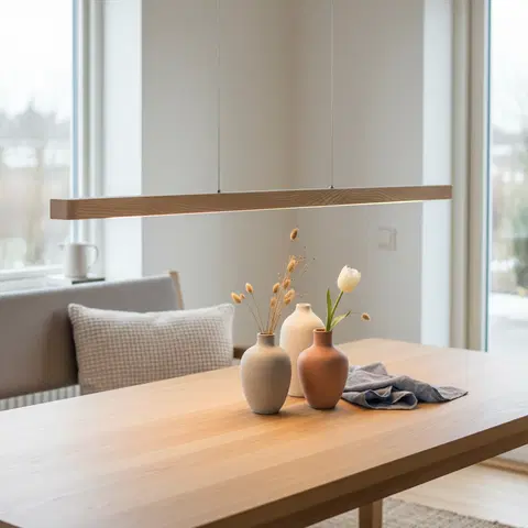 Ako taklampen fra Nova Life byr på et minimalistisk og moderne design med integrert LED-lys i en tidsriktig varm farge. Med sin kompakte form og naturlige treverk-estetikk passer denne hengende taklampen utmerket over spisebordet. Lampen har en bredde på 4 cm, en lengde på 120 cm og er kun 4 cm høy, noe som gjør den diskret i rommet. Den gir et behagelig og jevnt lys med sine 2400 lumen og 3000K fargetemperatur.