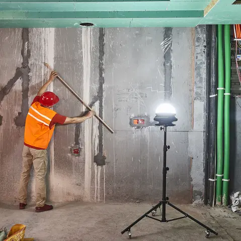 Denne robuste lampen er designet for tøffe arbeidsforhold med IP54-klassifisering for beskyttelse mot støv og vannsprut, IK08-støtbeskyttelse, og den tåler fall fra opptil 2 meter. Den kompakte størrelsen og solide konstruksjonen på 2,19 kg gjør den enkel å håndtere.