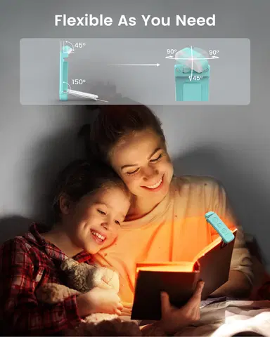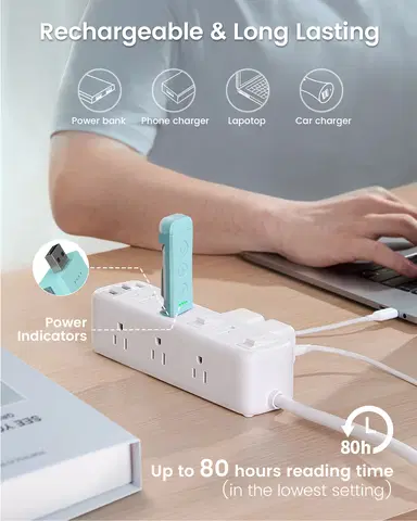 Denne LED-boklampen har et innebygd 500 mAh batteri som gir opptil 80 timers lesetid på laveste lysstyrke. På høyeste nivå varer batteriet i omtrent 10 timer. Dermed kan du ha glede av lampen i minst 20 dager hvis du leser 30 minutter daglig. (Ladetid 1,5 time).