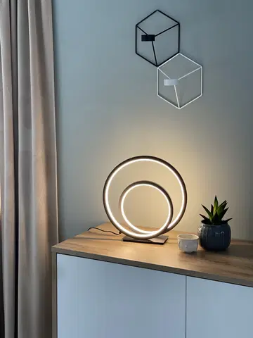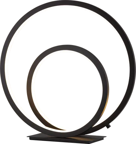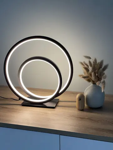 Circle Twin LED bordlampe fra Nova Life gir en flott lyseffekt med sitt unike og moderne design. Lampen har en matt sort finish i aluminium og silikon, og en integrert 18W LED-lyskilde med 500 lumen. Bordlampen har en behagelig fargetemperatur på 3000K og er dimbar med dimmer på ledningen, slik at du kan justere lysstyrken etter ønske.