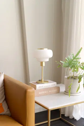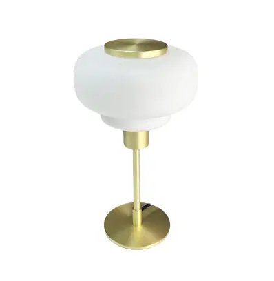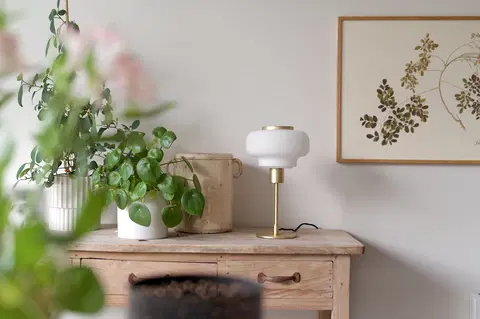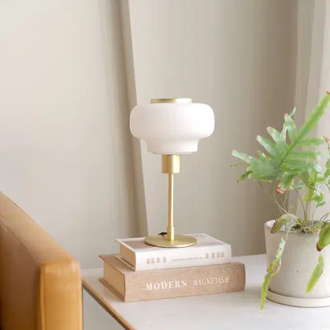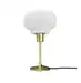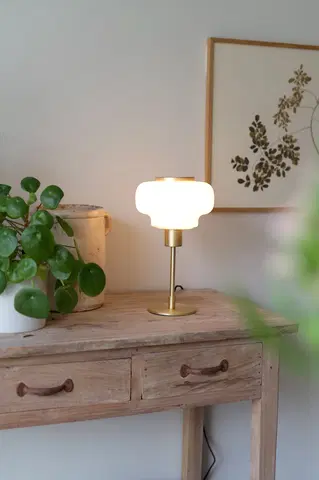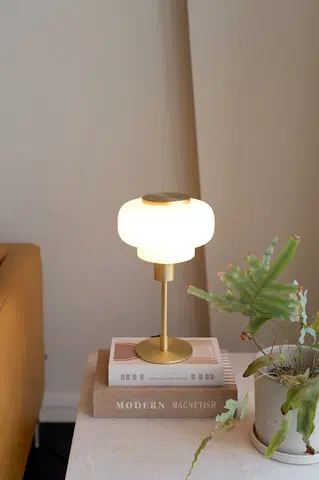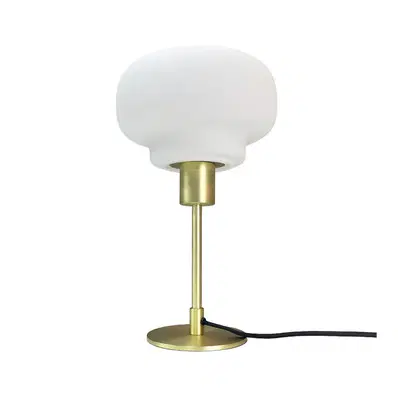 Soria bordlampe kombinerer tidløs eleganse med funksjonell belysning. Den runde skjermen i opalglass gir et mykt, diffust lys som skaper en lun atmosfære, mens messingfarget metall tilfører et eksklusivt preg. Perfekt som nattbordslampe, på en skjenk eller i en vinduskarm.