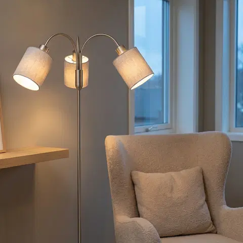 Felicia Trio fra Nova Life er en moderne gulvlampe med tre justerbare armer i stilren stålfinish, som gir fleksibel belysning og et industrielt preg til rommet. Lampen leveres uten skjermer, slik at du kan tilpasse lyset med egne lyspærer eller skjermvalg.