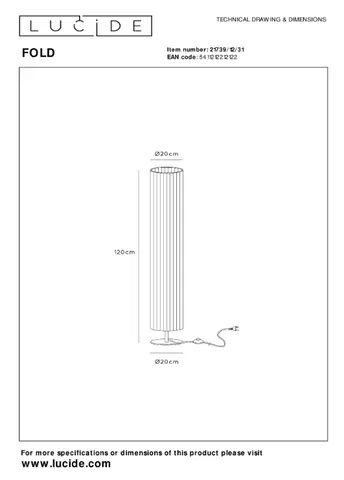 Med en høyde på 120 cm og diameter på 20 cm, passer Fold perfekt i stuen eller soverommet. Den er laget i metall og tekstil, og har en hvit farge som gir den et rent og tidløst utseende. Fold har to lyskilder med E27-sokkel, og du kan velge ønsket LED-pære basert på lysstyrke og farge. Lampen er dobbelt isolert for ekstra sikkerhet.