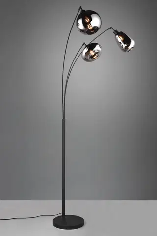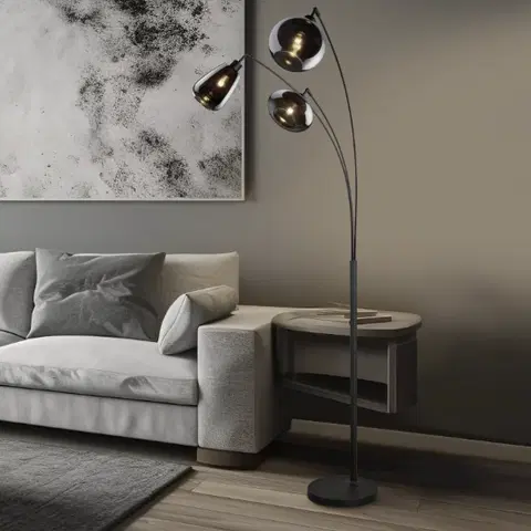 Lumina gulvlampen blir et spesielt blikkfang takket være sine elegante glassskjermer. De tre kuplene har ulike former som sammen med sammensetningen av metall og glass skaper en vakker og unik lysatmosfære. Den matte sorte fargeskalaen kombinert med røykfargede glasskjermer åpner for å integrere andre farger og gjør det enkelt å passe lampen inn i eksisterende interiørstiler.