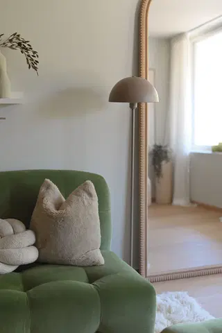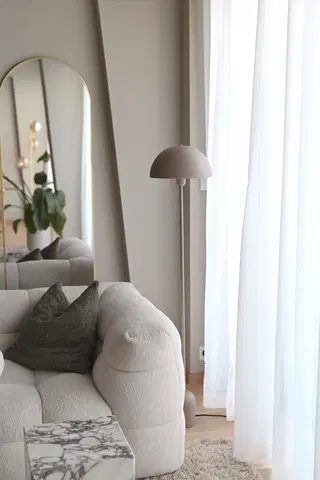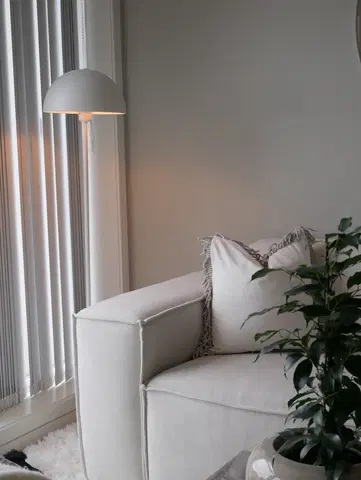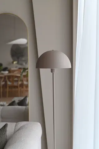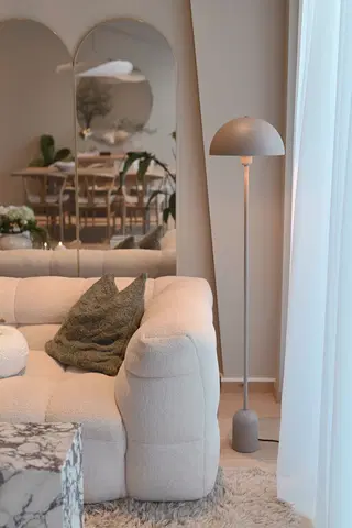 Med sitt skandinaviske design er Mycena en tidløs gulvlampe som passer inn i de fleste hjem. Den kuppelformede skjermen i beige metall bidrar til visuelt volum og et bredt lysfelt, noe som gir behagelig belysning til stue og kjøkken.