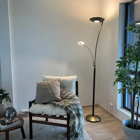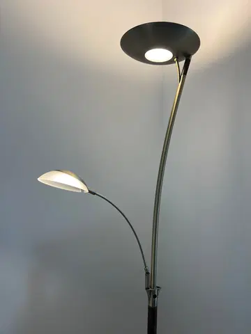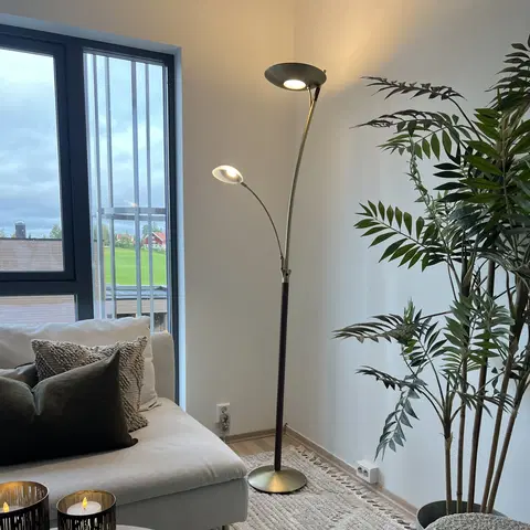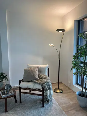 Helios LED uplight fra Stone Field er en eksklusiv og moderne gulvlampe i messing. Den stilrene designen kombinert med justerbar lesearm og dobbel dimmer gir deg full kontroll over belysningen. Med integrert LED-teknologi slipper du lampeskift og oppnår lavt energiforbruk og lang levetid. Toppen av lampen kaster 2000 lumen diffust lys, mens den bevegelige lesearmen gir konsentrert lys på 550 lumen. Reguler lysstyrken trinnløst med separate dimmere for å skape akkurat den stemningen du ønsker. Den solide konstruksjonen i messing står støtt med sin høyde på 187 cm og diameter på 45 cm. Helios er en kvalitetslampe med dobbelt isolering og IP20-klassifisering.