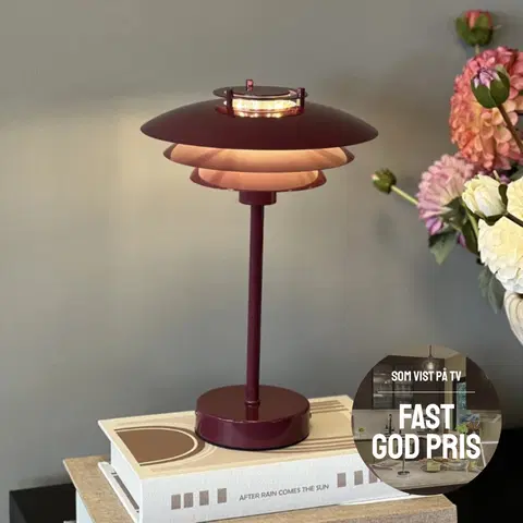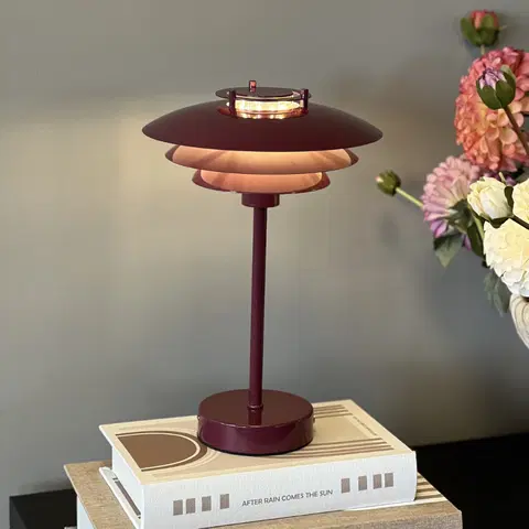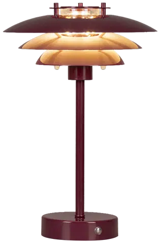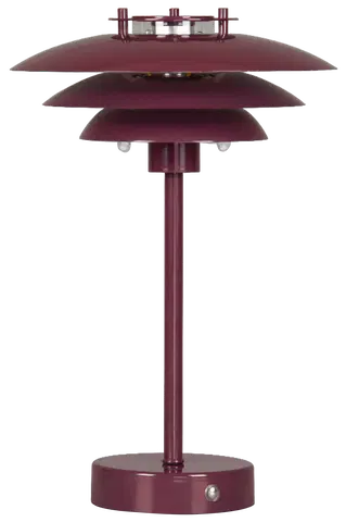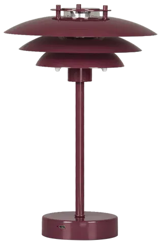 Batteriet lades opp på 2-3 timer, og gir deretter 4-6 timer med behagelig lys helt uten ledninger. Plommefargen og metallmaterialet gir lampen et tidløst og stilrent uttrykk.