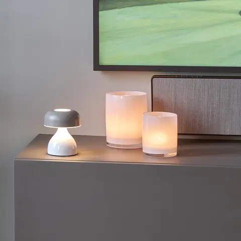 Lampens størrelse på kun 12 cm gjør den enkel å plassere hvor som helst, og den oppladbare LED-teknologien sørger for at du kan ta den med deg uten å være avhengig av stikkontakter. Den gir et jevnt og behagelig lys både fra toppen og gjennom den hvite basen, noe som skaper en koselig og rolig atmosfære uansett hvor den står.