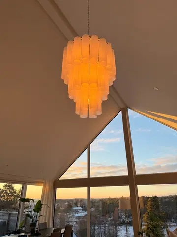Det klassiske frostede glasset kombinert med den moderne designen, gir lysekronen et tidløst og eksklusivt utseende. Den kan enkelt justeres i høyden og dimmes med dimbare pærer for å tilpasse belysningen etter behov. Denne spennende lysekronen vil være et flott blikkfang og skape en luksuriøs stemning i ethvert rom.