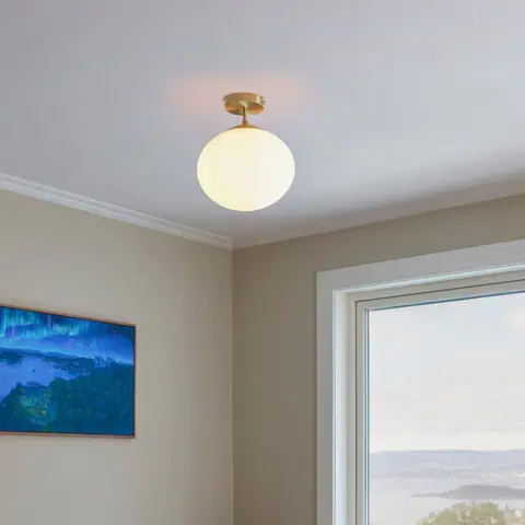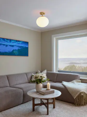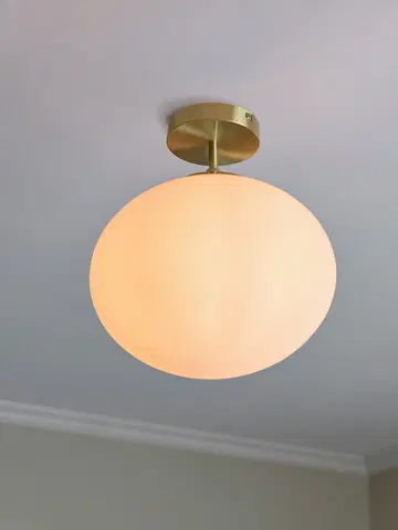 Fomento taklampe setter myke aksenter i hjemmet med sitt elegante design. Det ellipsformede lyshodet er laget av opalt glass som fordeler lyset behagelig i rommet. Kombinasjonen av matt messing og hvitt glass gir en raffinert stil. Denne taklampen måler 33 cm i høyde og 30 cm i diameter. Den har en E27-sokkel som er dimbar med dimbare pærer, men lyskilder medfølger ikke.