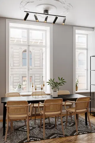 Fyll rommet med lys fra gulv til tak med Puls Bar spotskinnen fra By Rydéns. Denne elegante taklampen har fem justerbare spotter som lar deg vinkle lyset nøyaktig dit du ønsker. Den stilrene designen i matt sort metall med gulldetaljer gir et moderne uttrykk som passer inn i de fleste interiører.