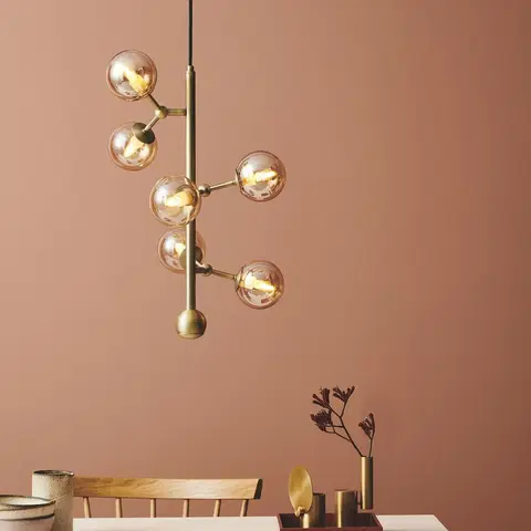 Atom Vertikal taklampe fra Halo Design bringer en dempet og jordnær atmosfære til rommet med sitt vakre design i antikk messing og ravfarget glass. Den minimalistiske konstruksjonen i metall og glass skaper et moderne uttrykk, mens de gylne nyansene tilfører en varm og rolig stemning. Lampen er justerbar og dimbar, noe som gir fleksibilitet til å tilpasse belysningen etter behov. Den børstede og mattlakkerte messingfinishen kombinert med det ravfargede glasset gir en unik og dristig fargeblanding. Med seks lyskilder på G9-sokkelen fordeles lyset jevnt i rommet. Atom Vertikal taklampe er en stilren og allsidig belysningsløsning som vil passe inn i mange moderne hjem. Lampen er dobbelt isolert og kompatibel med dimbare lyskilder på 28W.