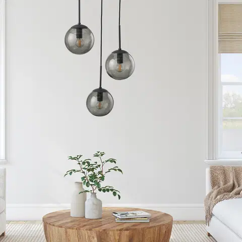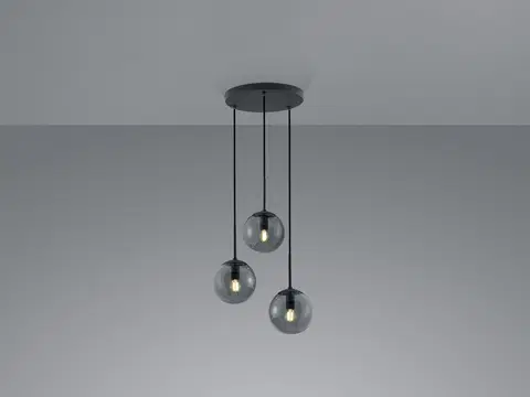 Balini taklampe fra Trio Lighting er en elegant hengelampe med røykfargede glasskupler. Den flotte designen med tre røykfargede glasskuler gir et mykt og behagelig lys som skaper en fin atmosfære i rommet. Lampen har en høyde på 150 cm og diameter på 40 cm, og har plass til tre lyskilder i E14-sokkelen.