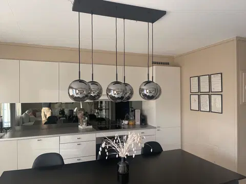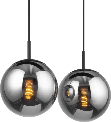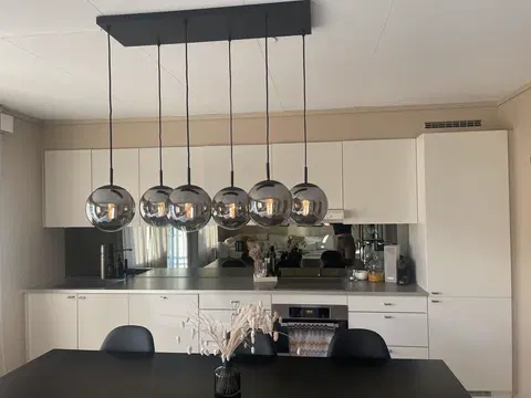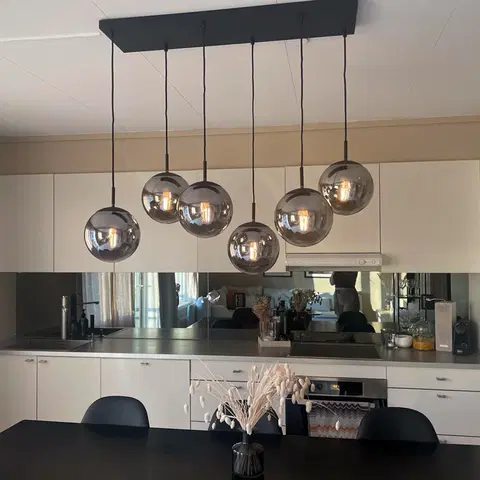 Ball taklampe med rektangulær base og røykfarget glass, kombinerer funksjonalitet og stil på en imponerende måte. Denne pendellampen har en matt sort base som elegant komplementerer det røykfargede glasset, noe som gir et moderne og sofistikert uttrykk til ethvert rom. Med muligheten til å justere høyden på lampens pendler, kan du tilpasse belysningen perfekt til dine behov.