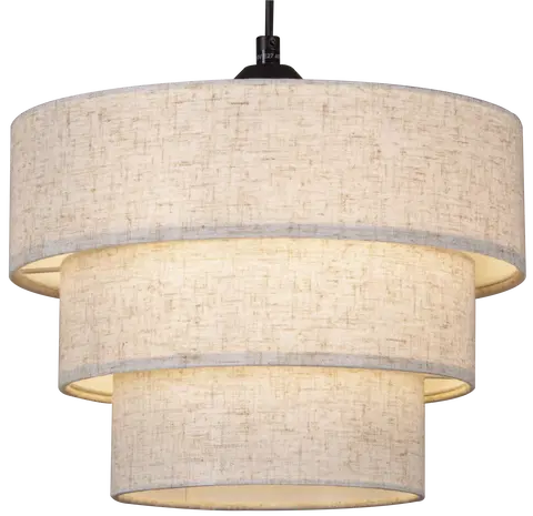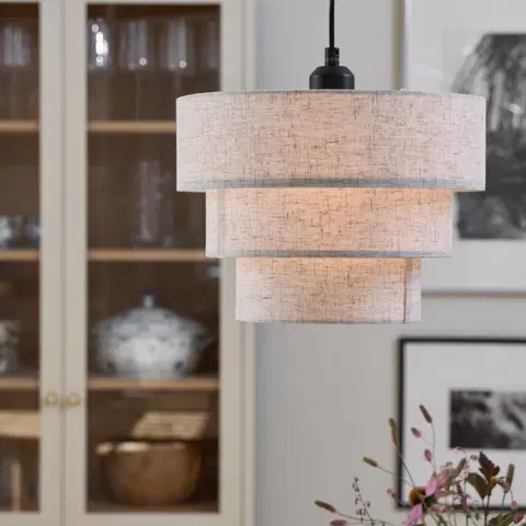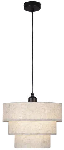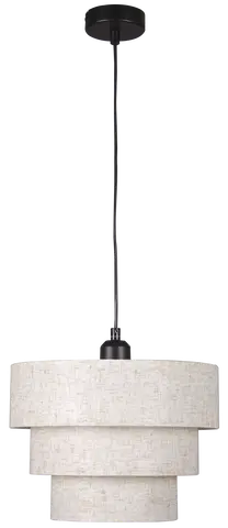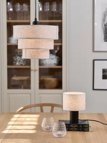 Lampen har tre skjermer i hvitt linstoff som gir et mykt og behagelig lys, ideelt for å skape en lun atmosfære. Den matte sorte metallrammen og den 1,2 meter lange ledningen gir et elegant kontrastpreg. Lampen er utstyrt med E27 sokkel og støtter opptil 40W, noe som gir fleksibilitet i valg av lyskilde. Perfekt til stue, soverom eller gang.
