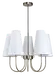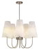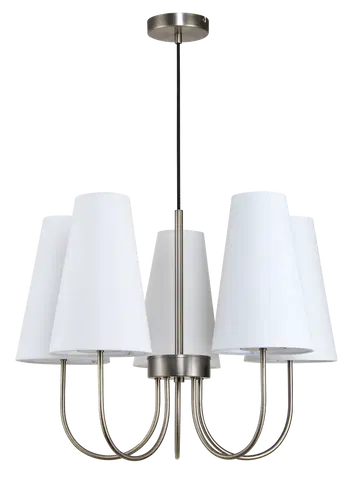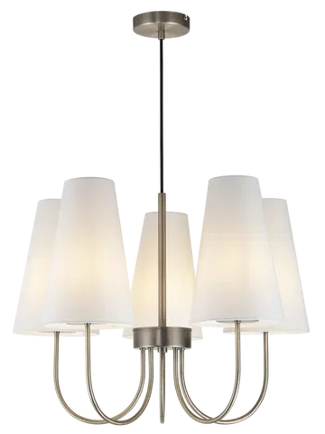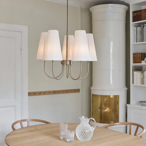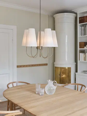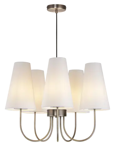 Charmante taklampe er en stilfull og tidløs lysekrone som kombinerer klassisk form med moderne eleganse. Med fem koniske lampeskjermer i hvitt tekstil og en varm finish i antikk messing, gir lampen et mykt og behagelig lys som skaper en innbydende atmosfære i rommet. De buede armene som strekker seg ut fra den sentrale stangen gir lampen et harmonisk og balansert uttrykk, perfekt for stue, spisestue eller soverom.