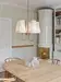 Den antikke messingfinishen tilfører varme og karakter, mens de hvite skjermene gir et rent og sofistikert preg. Lampen monteres i taket med en rund baldakin og henger elegant ned fra en sentral stang.