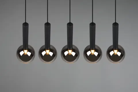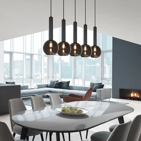 Denne pendellampen i metall og røykfarget glass egner seg ypperlig over middagsbordet eller i stuen, og gir et godt lys til flere formål.