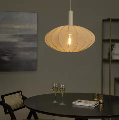 Lampen er laget av tekstil i en beige farge som gir et mykt og behagelig lys. Den har en høyde på 170 cm og en opphengslengde på 130 cm, slik at du kan tilpasse den til rommet ditt. Med en jordet sokkel på E27 gir den plass til én lyskilde på opptil 40W. Kompatibel med dimbare lyskilder som lar deg justere lysnivået etter behov.