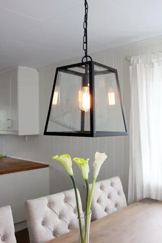 Dovre pendel fra MS Belysning er en moderne rustikk taklampe i sort metall og klart glass. Med sitt røffe design og kjettingoppheng får den et industrielt preg som passer perfekt til både stuen og kjøkkenet. Lampen blir ekstra flott ved bruk av dekorpærer som gir en lun og koselig atmosfære.