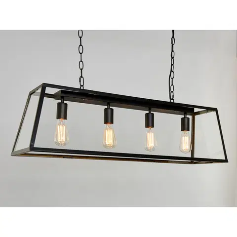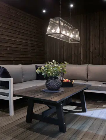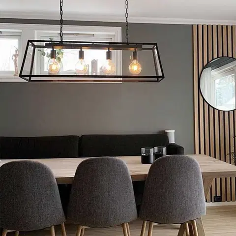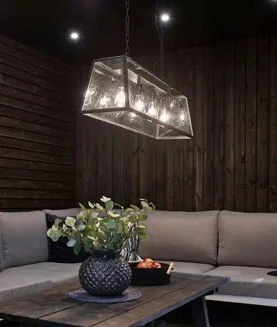 Dovre taklampe gir ditt hjem en moderne rustikk følelse med sin stilige design. Denne lampen har en solid ramme av sort metall, kombinert med klare glass som fullfører det estetiske uttrykket. Med kjettingoppheng og en åpen underside, inviterer denne lampen til å bruke dekorative pærer for å skape en varm og innbydende atmosfære i rommet.