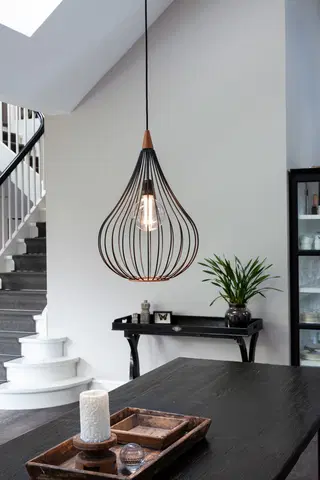 Drops fra Halo Design er en elegant pendellampe med en unik dråpeform. Utført i sort og treverk, kombinerer denne lampen moderne design med naturlige materialer. Den sorte tekstilledningen gir et dekorativt preg. Lampen er justerbar, slik at du kan tilpasse høyden og vinkelen for optimalt lys. Med en dimbar E27-sokkel har du full kontroll over lysstyrken og kan skape ønsket stemning. Drops har en diameter på 38 cm og en høyde på 56 cm. Den leveres uten lyskilde, så du kan velge din foretrukne pære. Denne pendelen fra Halo Design er en stilfull belysningsløsning som tilfører et naturlig og eksklusivt uttrykk. Lampen må installeres av en registrert installasjonsvirksomhet, og den leveres med 2 års garanti.
