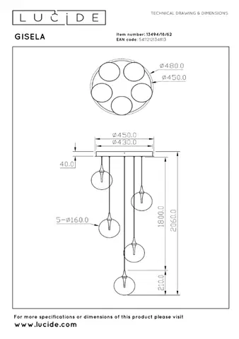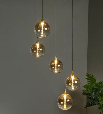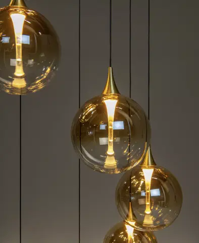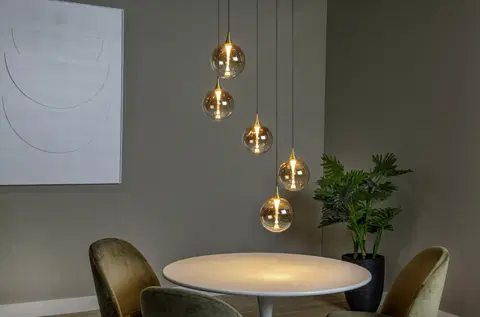 Har du noen gang følt at du må holde alle ballene i luften? Overlat det til Gisela - en sofistikert taklampe med fem pendler i klart glass, hver formet som en perfekt kule. Hver pendel har integrert LED-lyskilde som gir et varmt, hvitt lys (2700K), og kan justeres i høyden under montering. Du velger selv om du vil henge dem i samme nivå for et harmonisk uttrykk, eller la dem falle i ulike høyder for en mer dynamisk og leken stil.