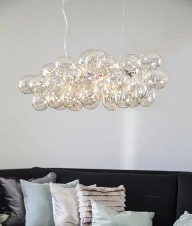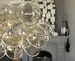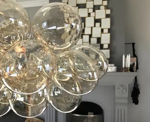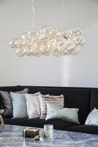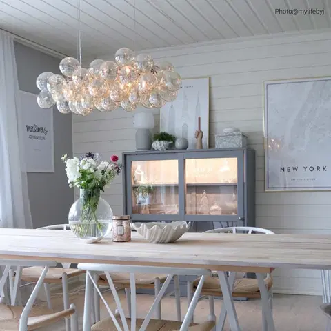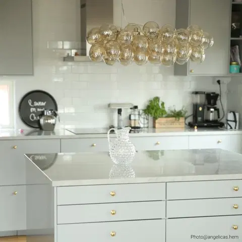 Gross Bar fra By Rydéns er en eksklusiv og justerbar taklampe som skaper en herlig stemning i rommet. Lampen består av 38 glasskuler i amber finish som sammen former en iøynefallende design. Med sin gylne farge og glasskulenes refleksjoner sprer den et varmt og behagelig lys over spisebord eller konferansebord.