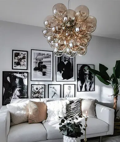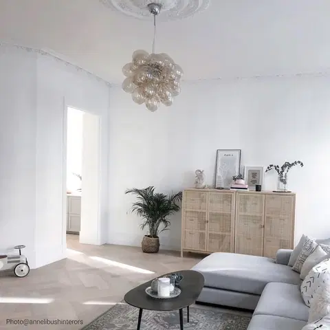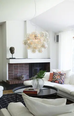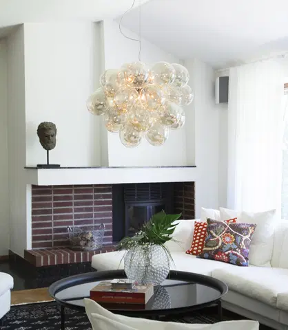 Gross Grande fra By Rydéns er en eksklusiv taklampe som virkelig fanger oppmerksomheten. Den består av 32 glasskuler i to størrelser, 10 cm og 15 cm, som sammen danner en imponerende konstruksjon i amber finish. Denne elegante kombinasjonen skaper en herlig, varm stemning i rommet.