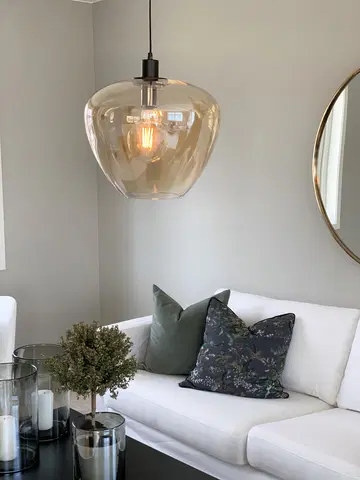 Ved å bruke en dekorpære i lampekuppelen, skapes en ekstra flott lyseffekt. Dette gjør lampen til mer enn bare en lyskilde; det er en del av rommets estetikk. Lampens runde form gir et moderne preg, mens det gyldne glasset varmer opp atmosfæren.