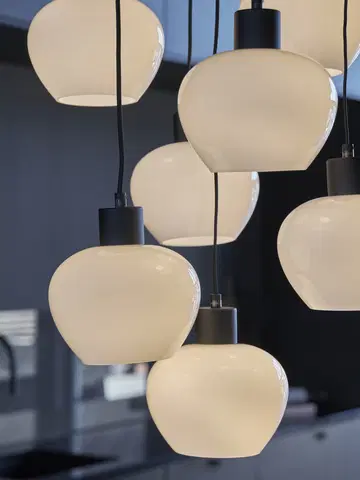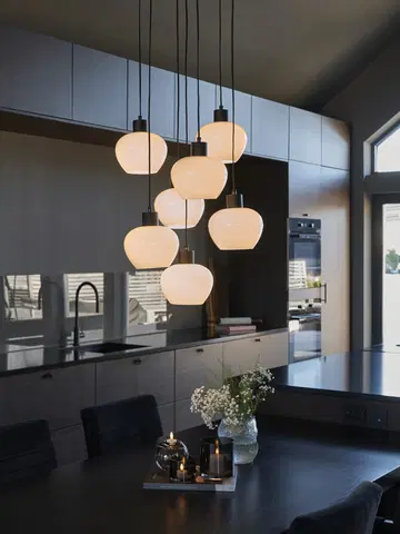 Kelly rondell taklampen fra Nova Life er en elegant hengende lampe med 7 pendler i vakkert hvitt munnblåst glass. Glassene har en diameter på 19 cm og en høyde på 21 cm, og hver pendel kan justeres til din foretrukne høyde. Luftbobler i glasset er ikke en feil, men et resultat av den håndverksmessige munnblåsingen.