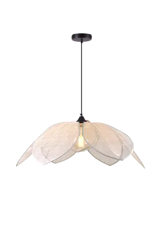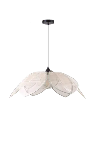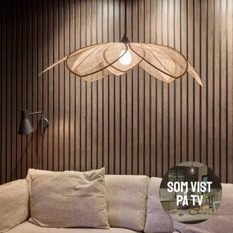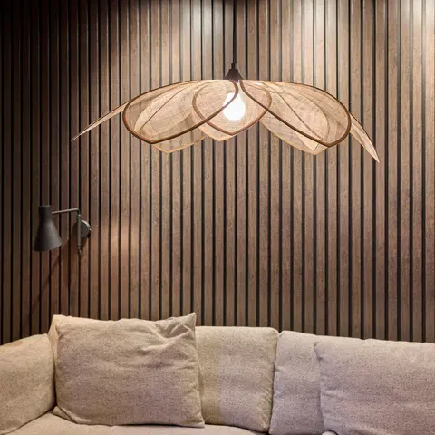 Skap et varmt og stilfullt uttrykk i hjemmet med Luftig Lotus taklampe fra Nova Life. Den dekorative skjermen består av 12 bladformede elementer i natur beige og sort metall, som gir et luftig, organisk preg samtidig som lyset filtreres på en behagelig måte.