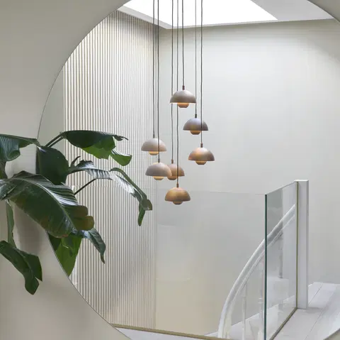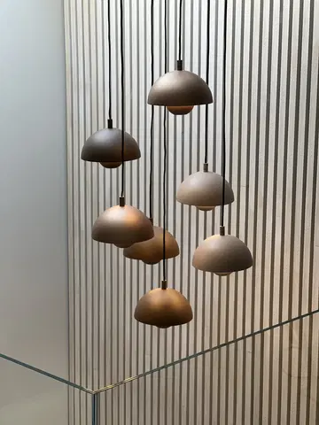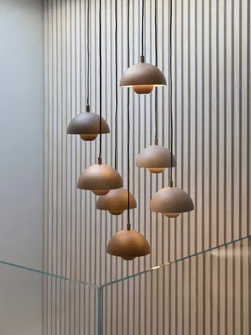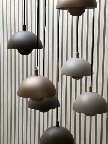 Mycena har en rund form som skaper et balansert og elegant uttrykk i taket. Det flerfargede designet gir lampen et særpreg, mens den nedtonede fargepaletten sørger for at den passer inn i et bredt spekter av interiørstiler, fra moderne til klassisk.