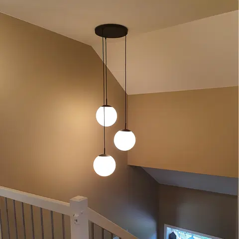 Lampen er dimbar, slik at du enkelt kan justere lysstyrken fra varmt og stemningsfullt til klart og funksjonelt lys. Hver glasskule har en diameter på 25 cm og gir et jevnt og behagelig lys som løfter rommet både estetisk og praktisk.