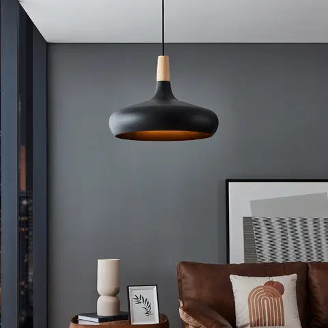 Sabinar taklampe fra EA/EGLO er en minimalistisk og stilfull lampe som vil passe perfekt i moderne hjem. Med sin sorte metallkuppel og tredetalj skaper den et dekorativt designelement i rommet. Lampen er hengende med en høyde på 110 cm og diameter på 40 cm, noe som gir et godt lysbilde over for eksempel spisebordet.