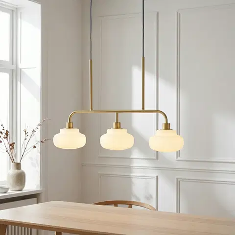 Soria taklampe kombinerer elegante materialer med et tidløst uttrykk. Lampen har en stilren konstruksjon i metall med detaljer i messing og tre skjermer i opalglass, som gir et mykt og behagelig lys. Perfekt som belysning i stue, soverom eller gang.