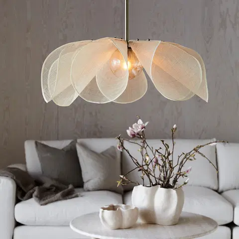 La Styrka taklampependel i Natur, lyse opp hjemmet ditt med sin unike og naturlige sjarm. Denne store, lyse taklampen har en diameter på 75 cm og er inspirert av naturens skjønnhet, noe som gjenspeiles i dens blomsterlignende design. Skjermen, laget av bananfiber, etterligner delikate kronblader og gir et mykt, diffust lys som skaper en varm atmosfære i rommet.