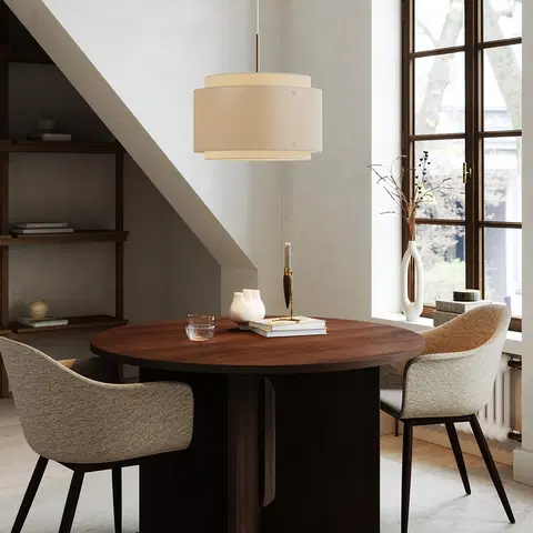 Lampeskjermen av lin gir et behagelig, filtrert lys som sprer seg jevnt i rommet. Den beige fargen tilfører en varm tone som passer godt til ulike interiørstiler. Takai har en høyde på 30 cm og en diameter på 45 cm, noe som gjør den passe for både stue og kjøkken.