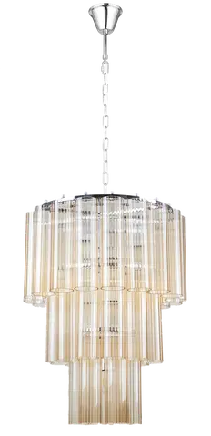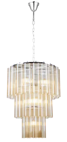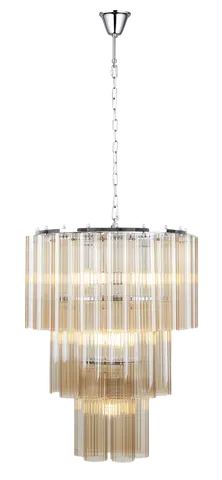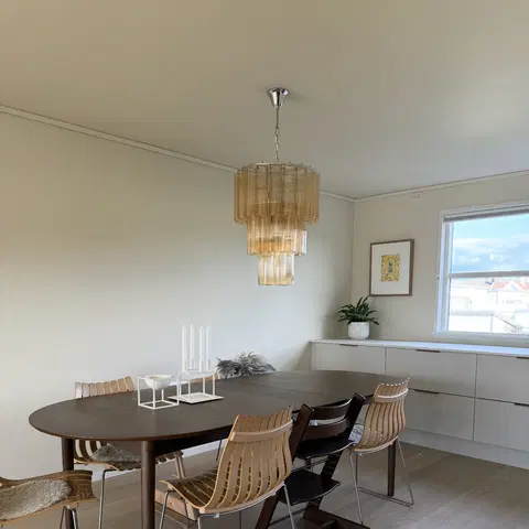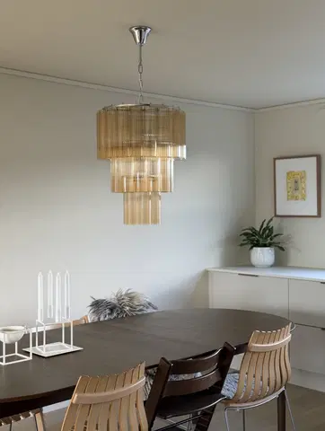 Venice lysekrone er en utsøkt kombinasjon av moderne design og tidløs luksus. Med 36 glasspaneler i en varm champagnefarge, skaper lampen et mykt og glitrende lysspill som gir rommet en eksklusiv og innbydende atmosfære. Den sylindriske formen og det blanke kromstativet gir et stilrent uttrykk, mens det varme lyset fra de 7 E14-lyskildene filtreres vakkert gjennom det fargede glasset.