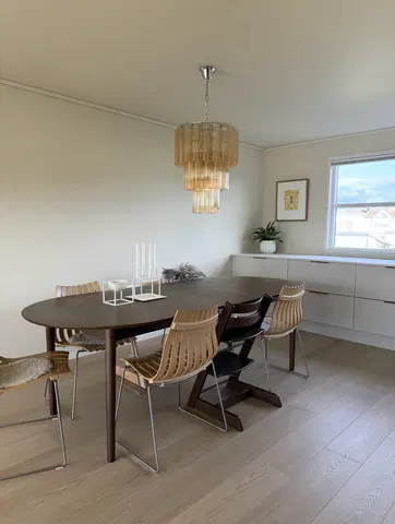 Lysekronen har en diameter på 50 cm og en høyde på 61 cm, med et oppheng på 140 cm - total høyde ca. 203 cm. Den passer perfekt i rom med god takhøyde, som stue, hall eller trappeoppgang, og fungerer som et elegant blikkfang.