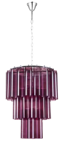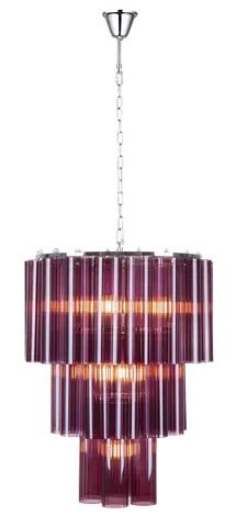 Venice lysekrone er et blikkfang av en lampe som kombinerer moderne glamour med klassisk form. Med sine 36 lilla glasspaneler fordelt i flere nivåer, skaper den et spektakulært lysspill og tilfører rommet en sofistikert og kunstnerisk atmosfære. Den sylindriske formen og det kromfargede stålet gir et moderne uttrykk, mens det varme lyset fra de 7 E14-lyskildene gir en behagelig glød gjennom det fargede glasset.