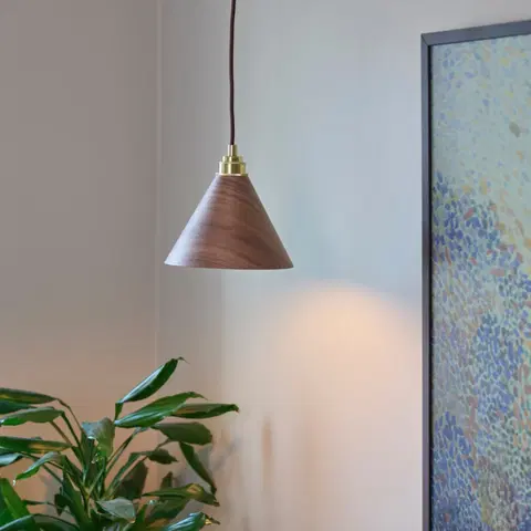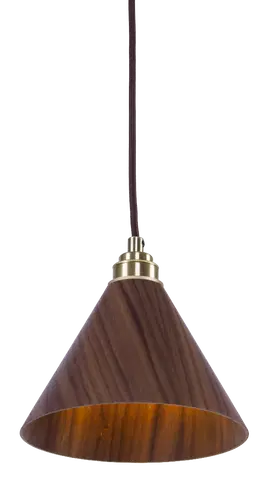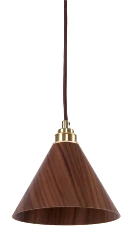Ravn pendel er en elegant og moderne taklampe med et tidløst design. Lampen har en skjerm i brunfinert treverk som gir et varmt og naturlig uttrykk, perfekt for både klassiske og moderne interiører. Den koniske formen sprer lyset jevnt nedover og skaper en behagelig atmosfære over spisebordet, kjøkkenøya eller i stuen.