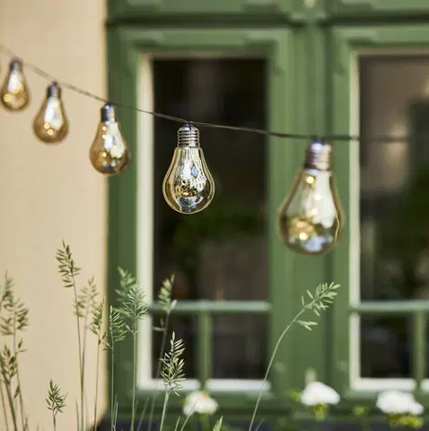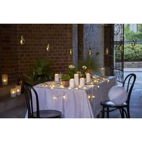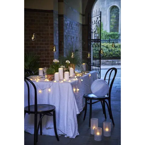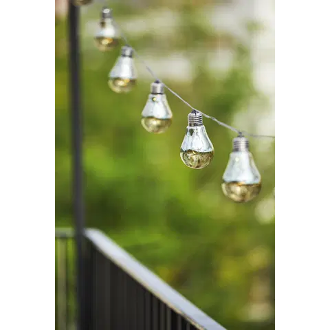 Denne lyslenken setter en flott lysstemning utendørs og på balkongen, enten det er en festlig anledning eller en hyggelig sommerkveld. Lyslenken må henge under tak.