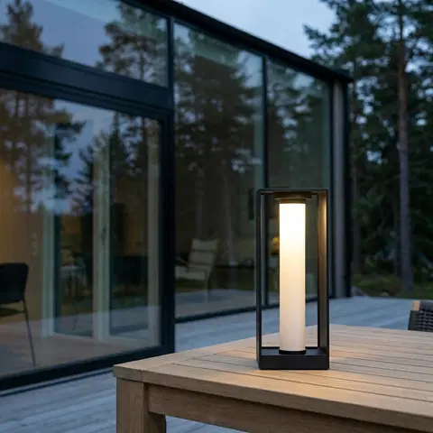 Oliver lykt i høyere utførelse gir et moderne og elegant uttrykk som løfter uteområdet. Den stilrene, rektangulære rammen i sort finish kombineres med en sylinderformet lyskilde som sprer et mykt og jevnt lys – perfekt for å skape en lun og innbydende atmosfære.