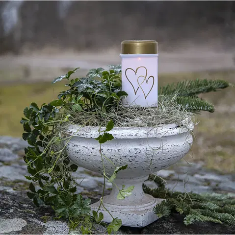 HEARTY er et stemningsfullt solcelle-gravlys som gir et varmt og varig lys på gravstedet - helt uten behov for batteribytte. Lyset er utformet i hvitt med dekorative hjerter, som gir et vakkert og verdig uttrykk.