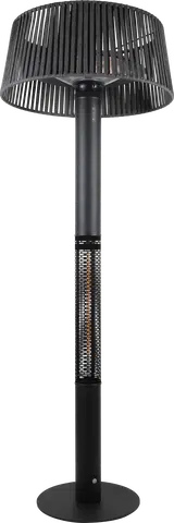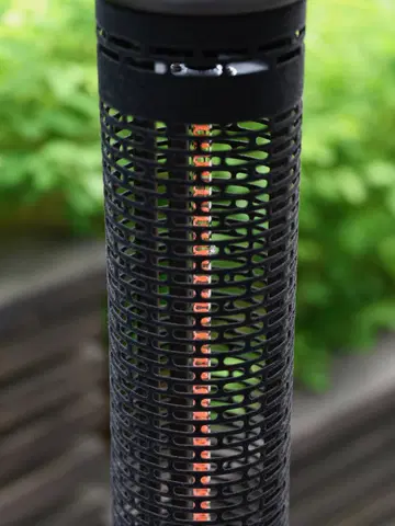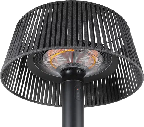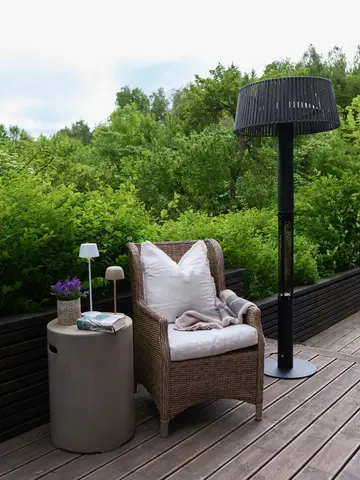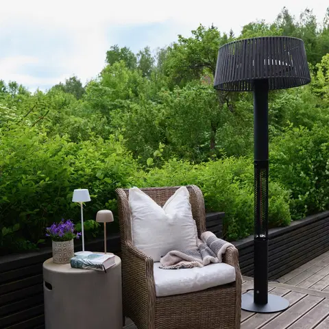 Denne terrassevarmeren har en stilren sort farge og en grå nylonskjerm som både beskytter varmekilden og gir et moderne uttrykk. Med en 3 meter lang ledning og støpsel, gir den fleksibilitet til plassering uten å være bundet til nærmeste stikkontakt.
