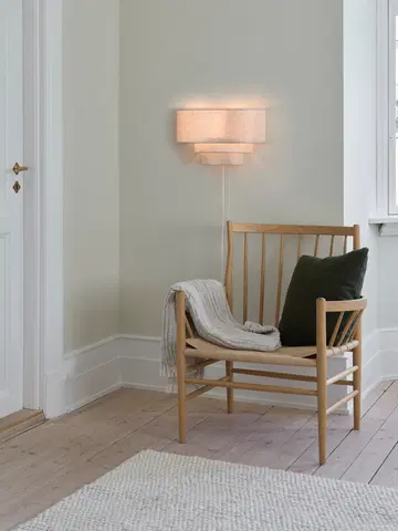 Blefjell Harmoni vegglampe er en dekorativ og stemningsskapende lampe som gir et varmt, behagelig lys og et unikt visuelt uttrykk. Den bølgende skjermen i lyst tekstil gir assosiasjoner til naturens myke former og skaper en harmonisk atmosfære i rommet. Med sin tredelte, organiske form gir lampen et vakkert lysspill både oppover og nedover.