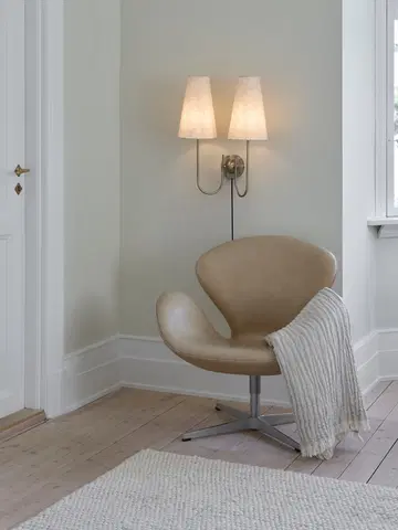 Med sine to lys gir Charmante vegglampe et godt, men dempet lys - perfekt som stemningslys i stuen, på soverommet eller i en gang hvor du ønsker et hint av klassisk eleganse. De medfølgende skjermene i linstoff kompletterer det stilrene designet og gjør lampen lett å kombinere med både tradisjonelle og moderne interiører.