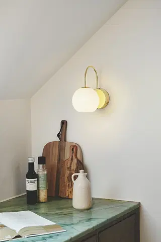 Franca vegglampe fra Nordlux har et eksklusivt og elegant design med vakkert blankt glass og skinnende messing. Den hvite glasskuppelen skaper et mykt og diffust lys, perfekt over kjøkkenbenken eller i gangen. Glasset er munnblåst og håndlaget, noe som gir lampen sin unike karakter med små luftbobler og variasjoner i tykkelsen. Dette gir et levende og naturlig utseende.